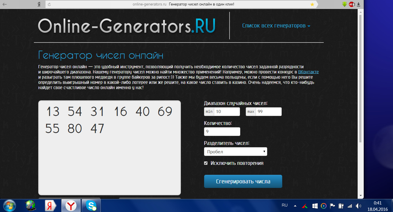 Каждую неделю или раз в две недели (зависит от активности пользователей) я буду генерировать 9 двузначных чисел и выкладывать на сайте скриншот с этими числами.
